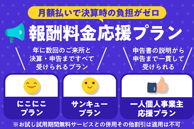 「にこにこプラン」「サンキュープラン」は、月額報酬料金のみで年に数回のご来所から、決算、申告まで全てのサービスが受けられる料金プランとなっております。